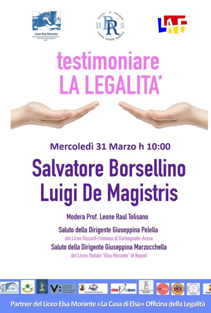 Il 31 marzo abbiamo avuto l’occasione di partecipare all’incontro Testimoniare la legalità con Salvatore Borsellino, fratello minore di Paolo Borsellino e il sindaco di Napoli, Luigi de Magistris. L’evento è stato organizzato dal professor Raul Leone Tolisano e voluto dalla Dirigente Giuseppina Pelella in collaborazione con la Dirigente Giuseppina Marzochella del Liceo Elsa Morante di Napoli.