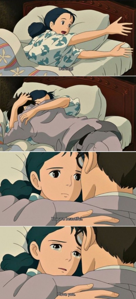 La salute di Nahoko peggiora e Jirō corre da lei, e qui lo Studio Ghibli ci offre una delle più belle manifestazioni d’amore del film; una nota di merito sono infatti i piccoli gesti e manifestazioni d’amore, costanti nel film e piene di carica romantica e significati di una dolcezza infinita, tra carezze, baci e parole gentili. Nahoko parte per un sanatorio in montagna, e Jirō continua il suo lavoro. Dopo qualche tempo la ragazza fugge per tornare dal suo amato, che allertato dal sanatorio corre in stazione. I due si incontrano, si corrono incontro tra la folla e si stringono forte, lei per la debolezza quasi cade, ma lui la sorregge, la stringe, la bacia, si guardano negli occhi e fanno percepire in pieno allo spettatore la forma del loro amore. I due tornano a casa e qui, i padroni della villa in cui Jirō è ospitato, sposano i giovani per farli vivere sotto lo stesso tempo. La convivenza è fatta di bei momenti, carezze, lavoro fino a tarda notte mano nella mano e “nannine” molto stanche uno abbracciato all’altra.