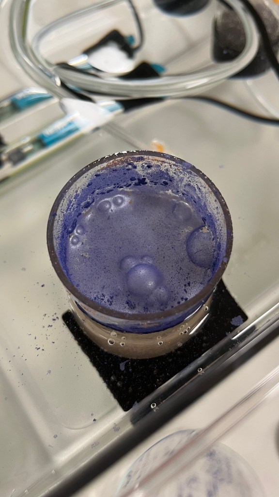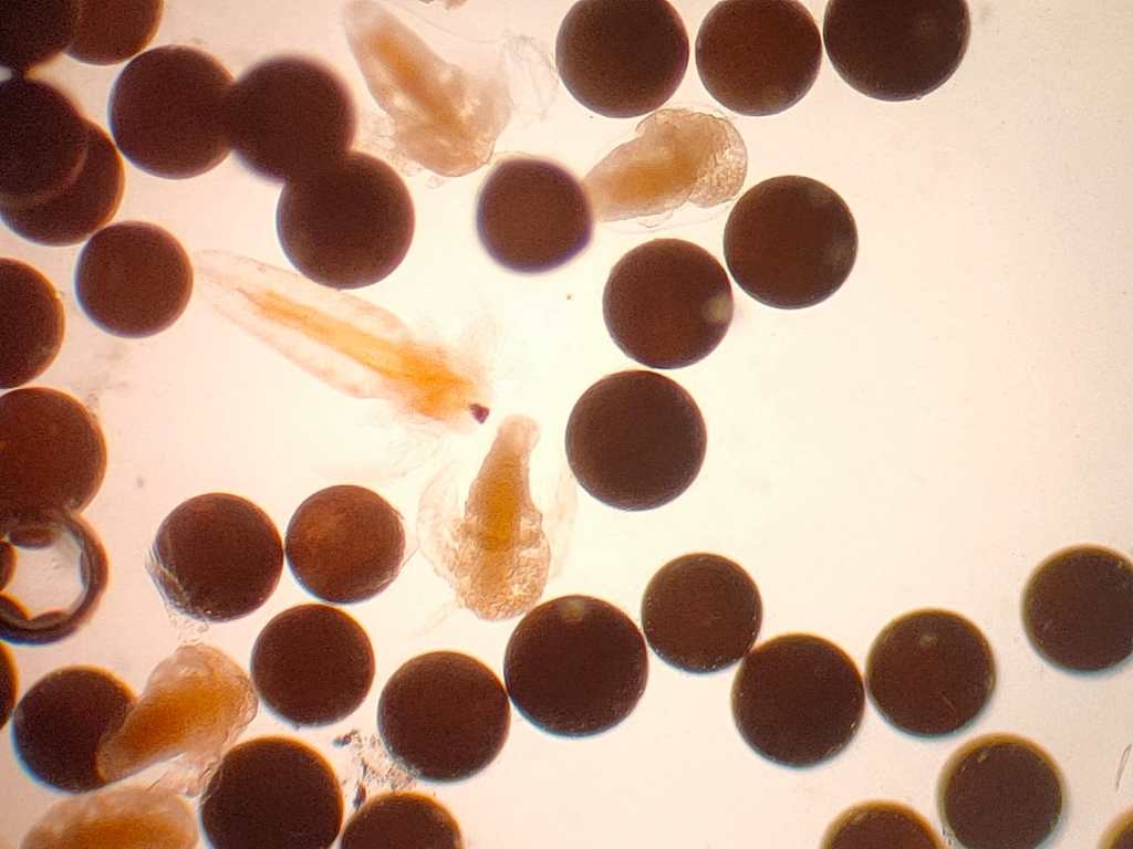 Inizialmente ho provveduto a far schiudere le uova (cisti) di artemia salina, e una volta schiuse ho dovuto aspettare uno o due giorni prima di esporle alle microplastiche. Il problema iniziale è stato quello di scegliere che tipo di plastiche somministrare alle larve. Ho scoperto che fino al 2020 i cosmetici contenevano particelle di microplastiche. Ho raccolto dei cosmetici prodotti prima del 2020 e a quel punto ho cercato di ridurne le dimensioni: prima li ho passati in un mortaio e dopodiché li ho filtrati in un setaccio da 0,15 mm. In questo modo ho ottenuto una polvere molto sottile che ho somministrato alle larve. Oltre ai cosmetici ho utilizzato del PET (polietilene tereftalato), ottenuto da dei tappi di bottiglia grattugiati su carta vetrata molto sottile; ho filtrato poi la polvere attraverso lo stesso setaccio e l’ho somministrata alle larve.